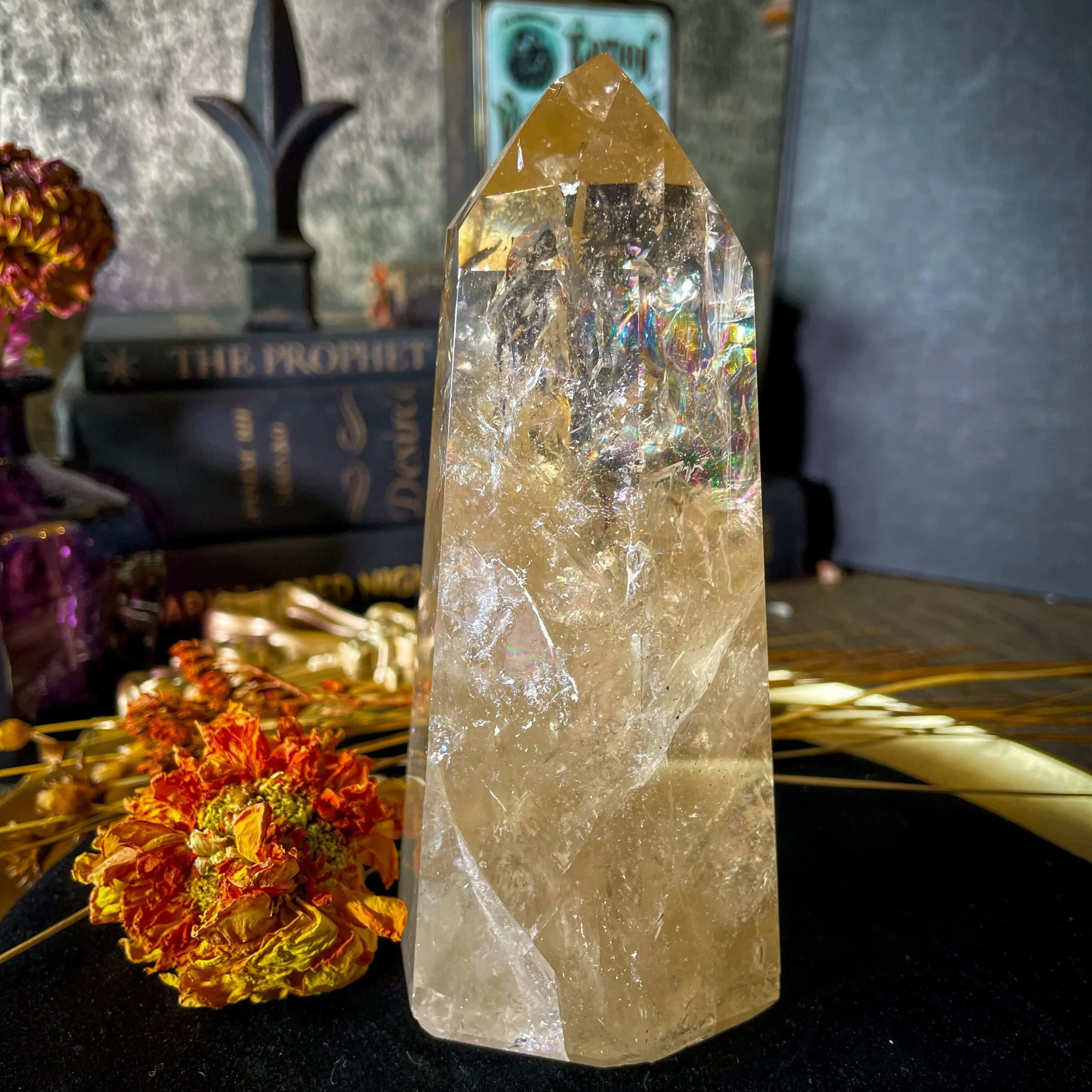 One Yellow Hematoid Quartz Generator (approx. 4.5” tall x 2.25” x 4.5”) with polished facets and glowing golden warmth.